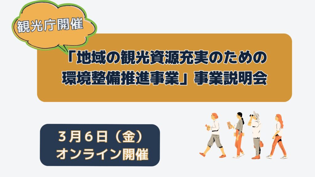 観光庁より、令和7年度補正予算 観光庁「観光需要分散のための地域観光資源のコンテンツ化促進事業」の事業説明会を令和8年2月13日(金)に開催する旨のお知らせです。 【事業概要】 本事業は、観光による経済効果を全国津々浦々 […]