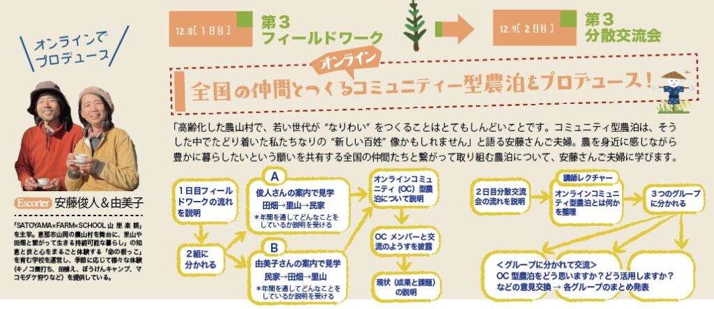 農を身近に感じながら豊かに暮らしたいという願いを共有する全国の仲間たちと繋がって取り組むオンラインコミュニティ型農泊について安藤さんご夫婦から学びます。