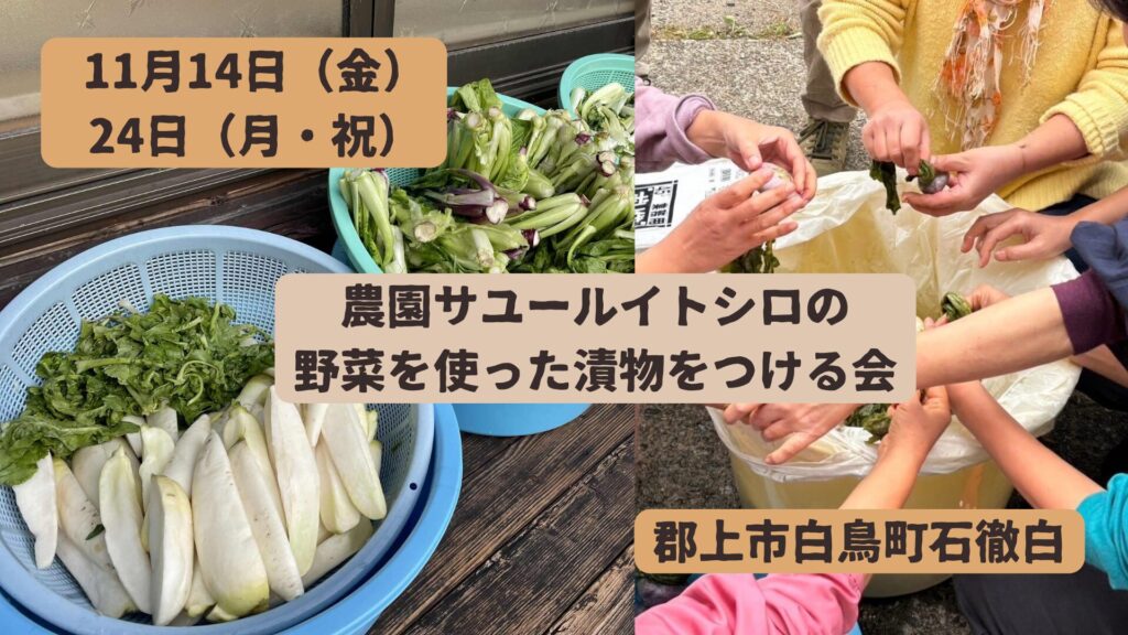 秋真っ只中ですが、日に日に朝晩の冷え込みが強めになって参りました!雪国はあっという間に冬が来ます。雪が降る前に「石徹白かぶら」や「しろ菜(雪白体菜)」を使った漬物を漬ける会を開催いたします!漬ける野菜は、農園サユールイト […]