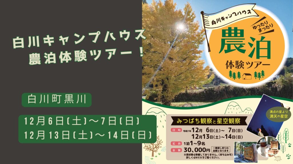 白川町黒川の「白川キャンプハウス」さんより、農泊体験ツアーのご案内!12/6〜7、12/13〜14は、みつばち観察と星空観察を実施します。キャッチコピーは、満点の星より満天の星空!ぜひ、お楽しみください。 ーーーーーーー […]