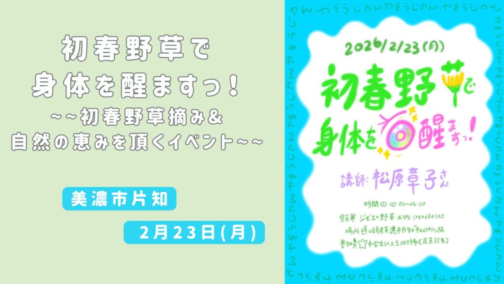 2026年2月23日(月)初春野草摘み&自然の恵みを頂くイベントのお知らせです🌿📢 \あなたの身体、冬眠してませんか?/岐阜県郡上市から“足元のお宝”野草発掘、発酵、保存食、郷土食 […]