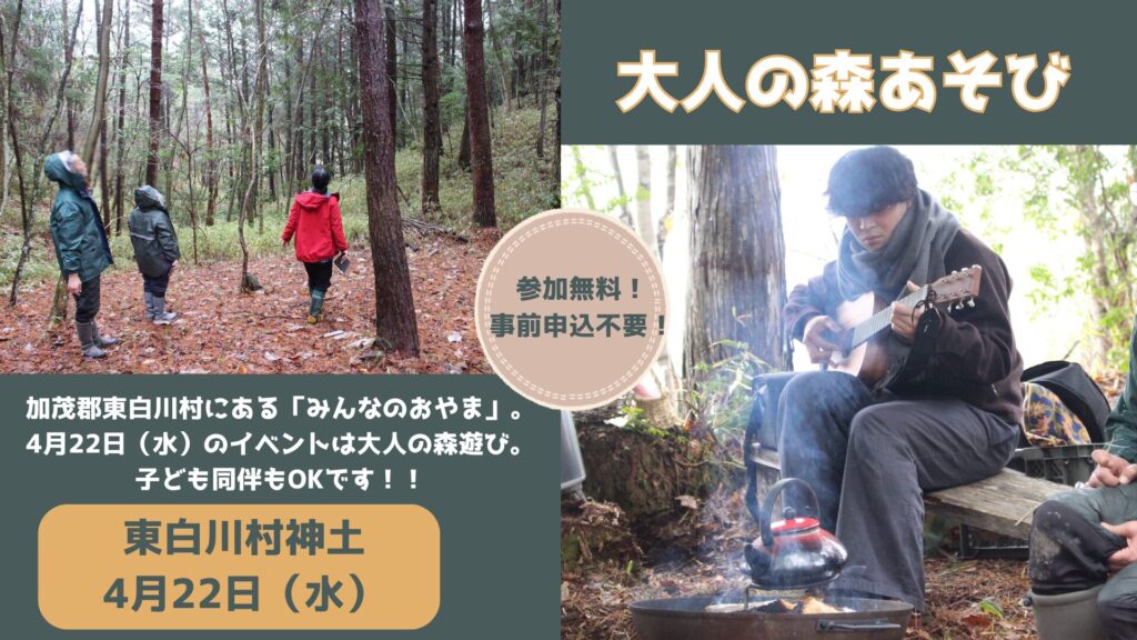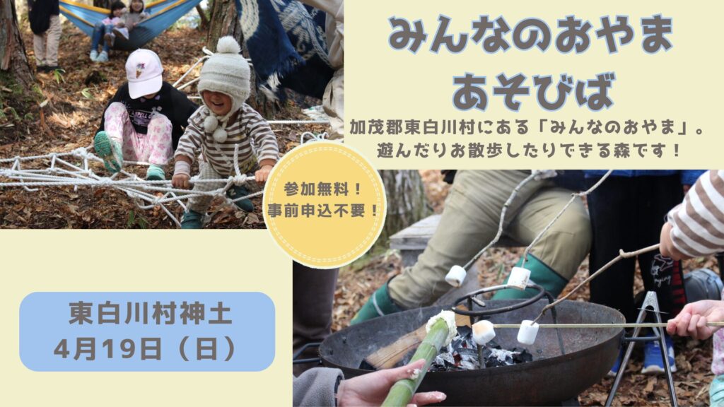 春のおやまでめいっぱいあそぼう! みんなのおやまは、加茂郡東白川村にある、遊んだりお散歩したりできる森です。ひみつきちづくり、ロープと木でジャングルジム、まつぼっくりあつめ、自然素材の工作…たき火でマシュマロを焼いたり、 […]