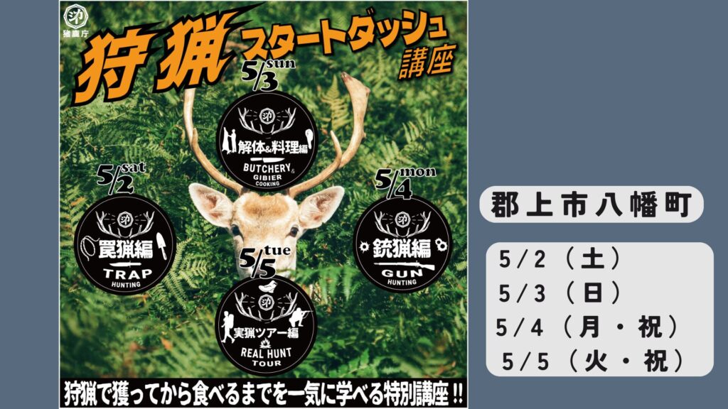 GW連休に、初心者、免許未取得の方でも『狩猟』の知識と技術をイッキに身につけることができる、超実践的・狩猟ワークショップ『狩猟スタートダッシュ講座』を猪鹿庁の拠点、岐阜県郡上市のキャンプ場にて実施します! 「罠猟や銃猟に […]