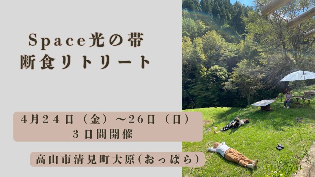 標高820m、高山市清見町大原(おっぱら)。こちらはスイセンが芽を出し始め、猿やカモシカ達が活動的になり始めました。眩しい新緑の時期に開催される、断食リトリートのお知らせです。ココロとカラダをリセットしに、是非おいでくだ […]