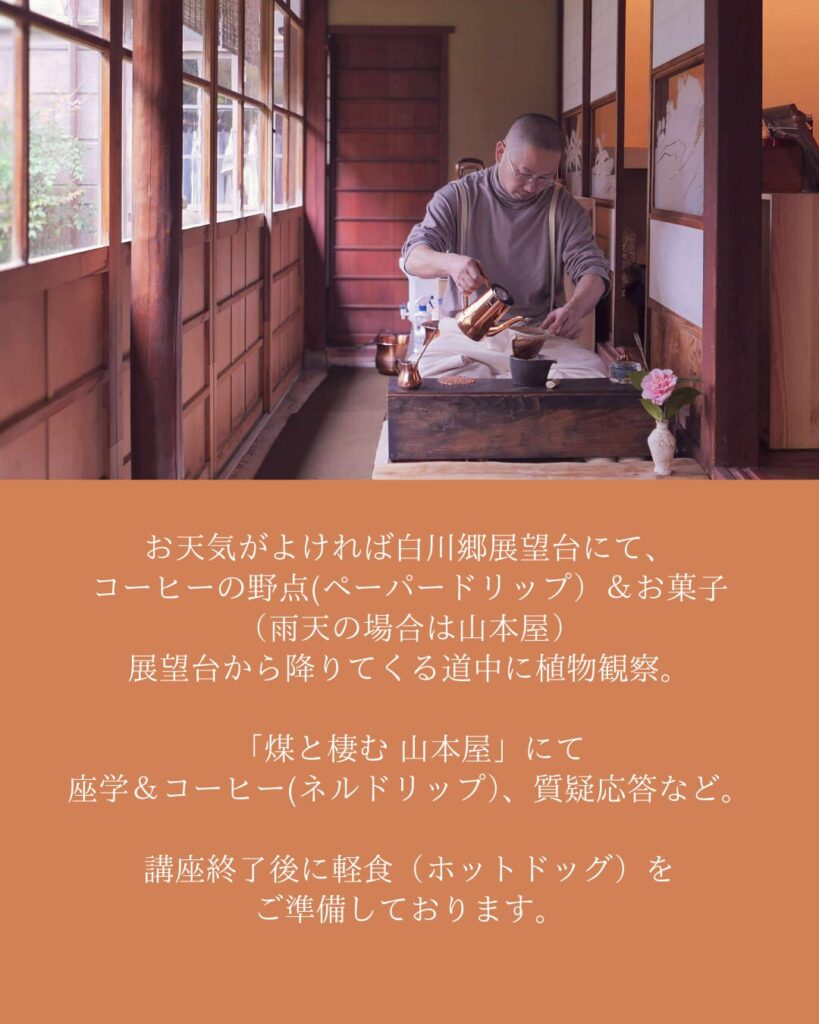 冬が近づく白川郷です。温かい格好で、また展望台で散策したり山本屋まで歩きますので動きやすい服や靴をお選びください。みなさんで奥深い珈琲の世界を楽しみましょう。