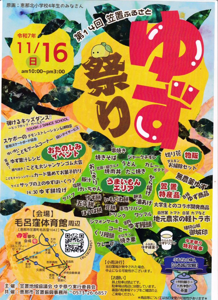 笠置町の特産品である「生ゆず」とゆずを使った商品の販売をはじめ、こども大ジャンケンゴム大会・ゆず餅投げ・弾けるキッヅダンスなど楽しさいっぱい!