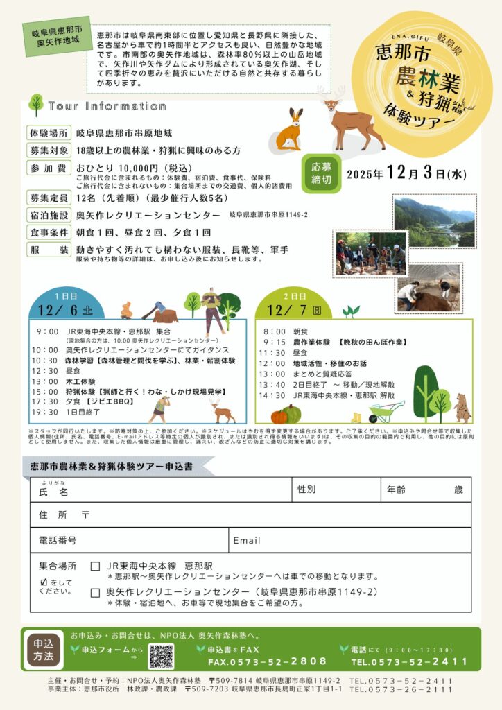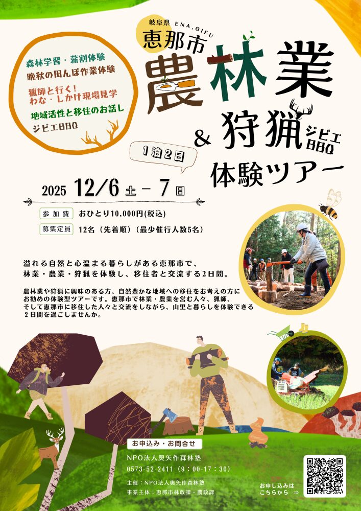 溢れる自然と心温まる暮らしがある恵那市で、林業・農業・狩猟を体験し、移住者と交流する2日間。