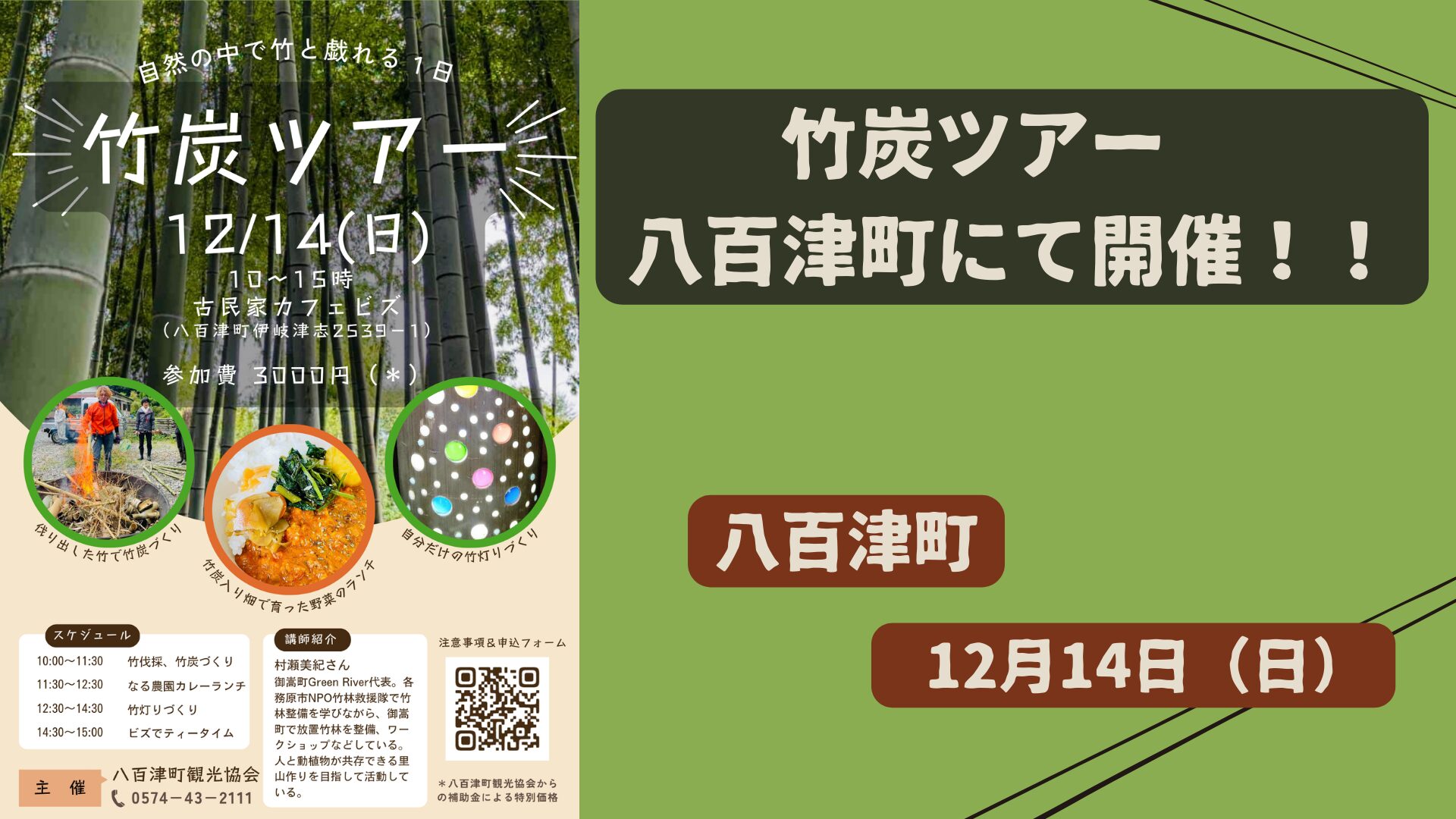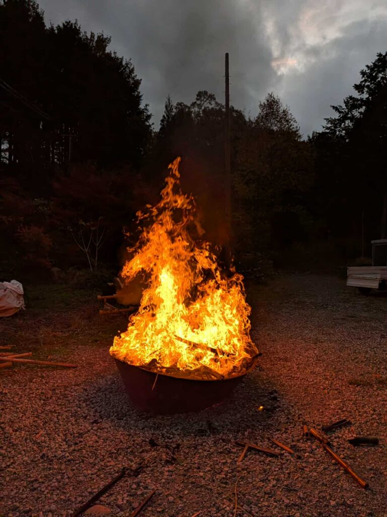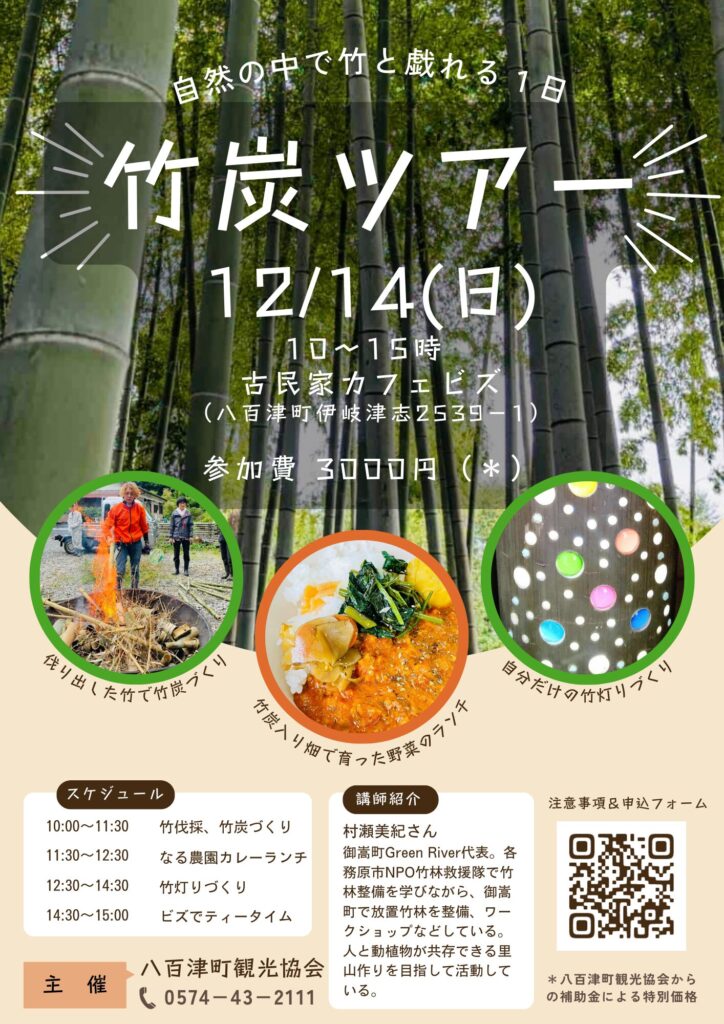 眺めの良い木曽川沿いのカフェのお庭をお借りして、竹林の整備をお手伝いしながら竹炭を焼き、竹炭畑で育った野菜カレーを食べ、竹灯り(クリスマスバージョン)を作る、ぜいたくな1日。