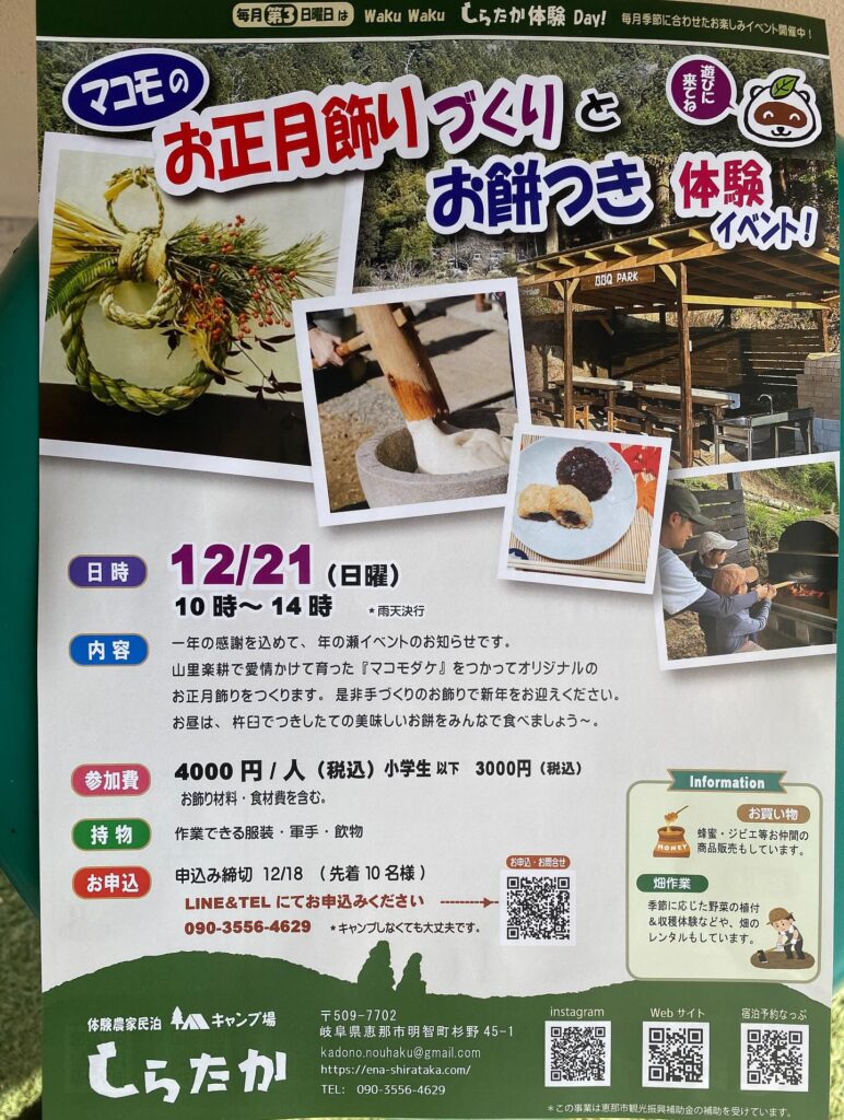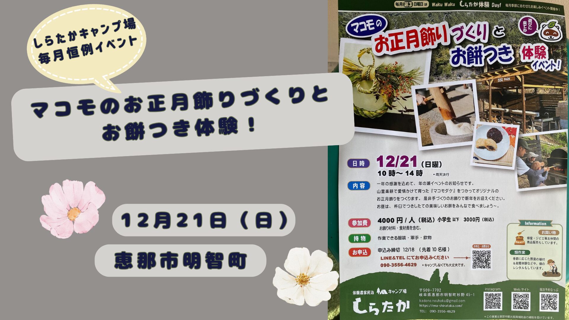 恵那市山岡町の”山里楽耕”で愛情かけて育った『マコモダケ』をつかって、オリジナルのお正月飾りをつくります。是非手づくりのお飾りで新年をお迎えください。