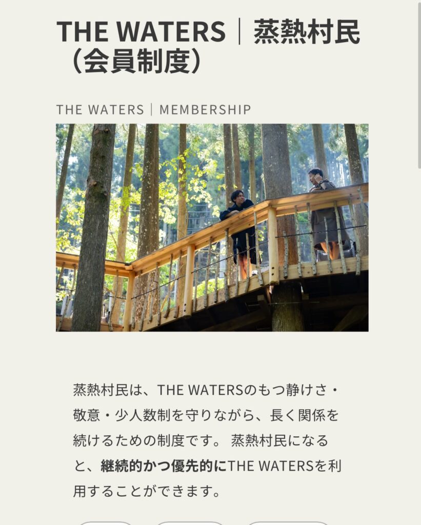 蒸熱村民は、THE WATERSのもつ静けさ・敬意・少人数制を守りながら、長く関係を続けるための制度です。 蒸熱村民になると、継続的かつ優先的にTHE WATERSを利用することができます。