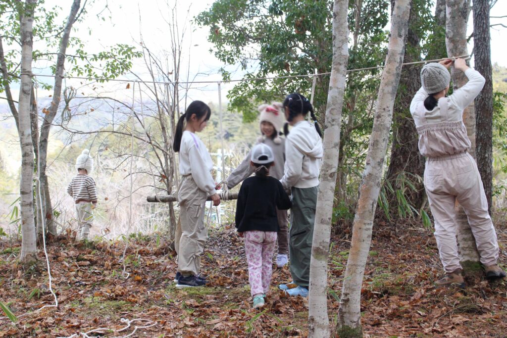 ひみつきちづくり、ロープと木でジャングルジム、まつぼっくりあつめ、自然素材の工作…