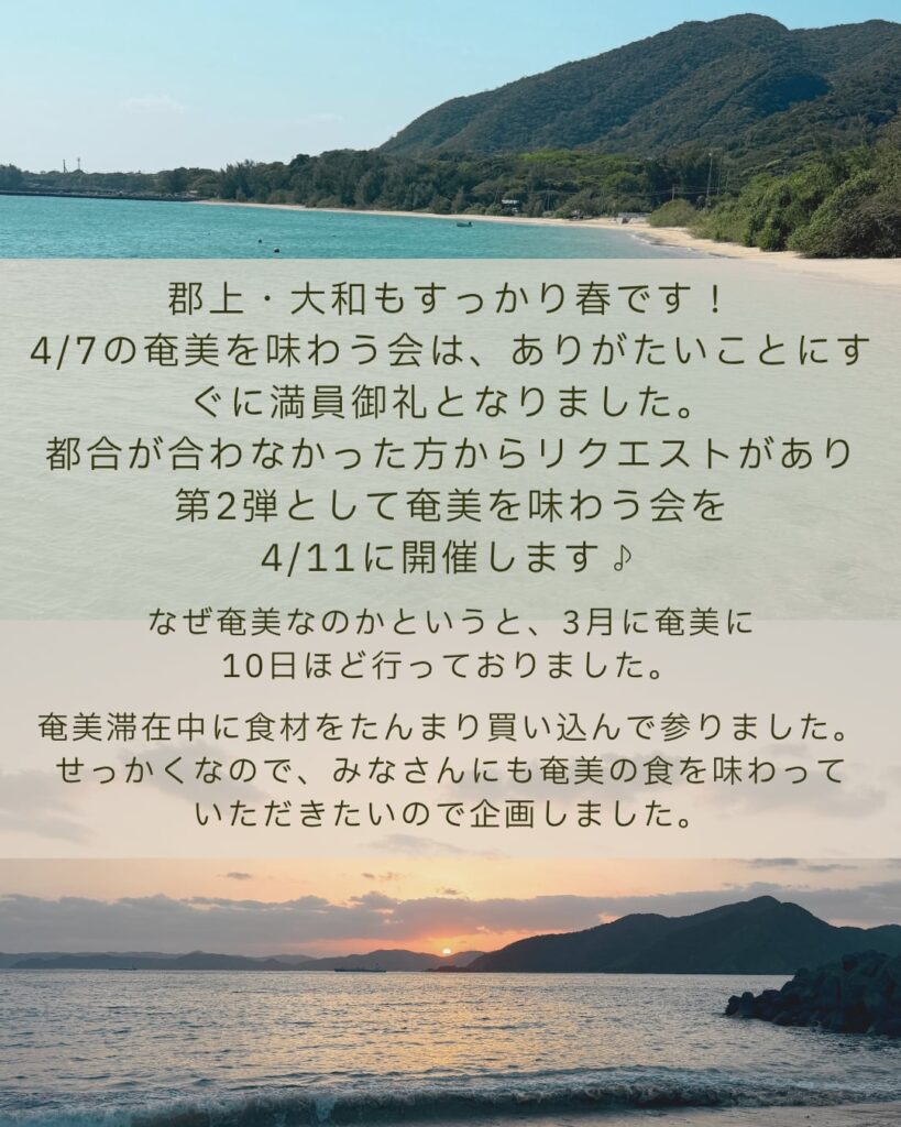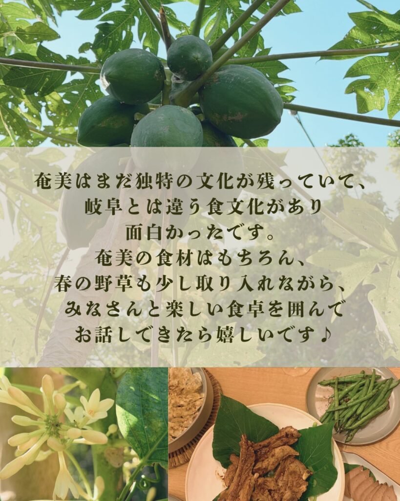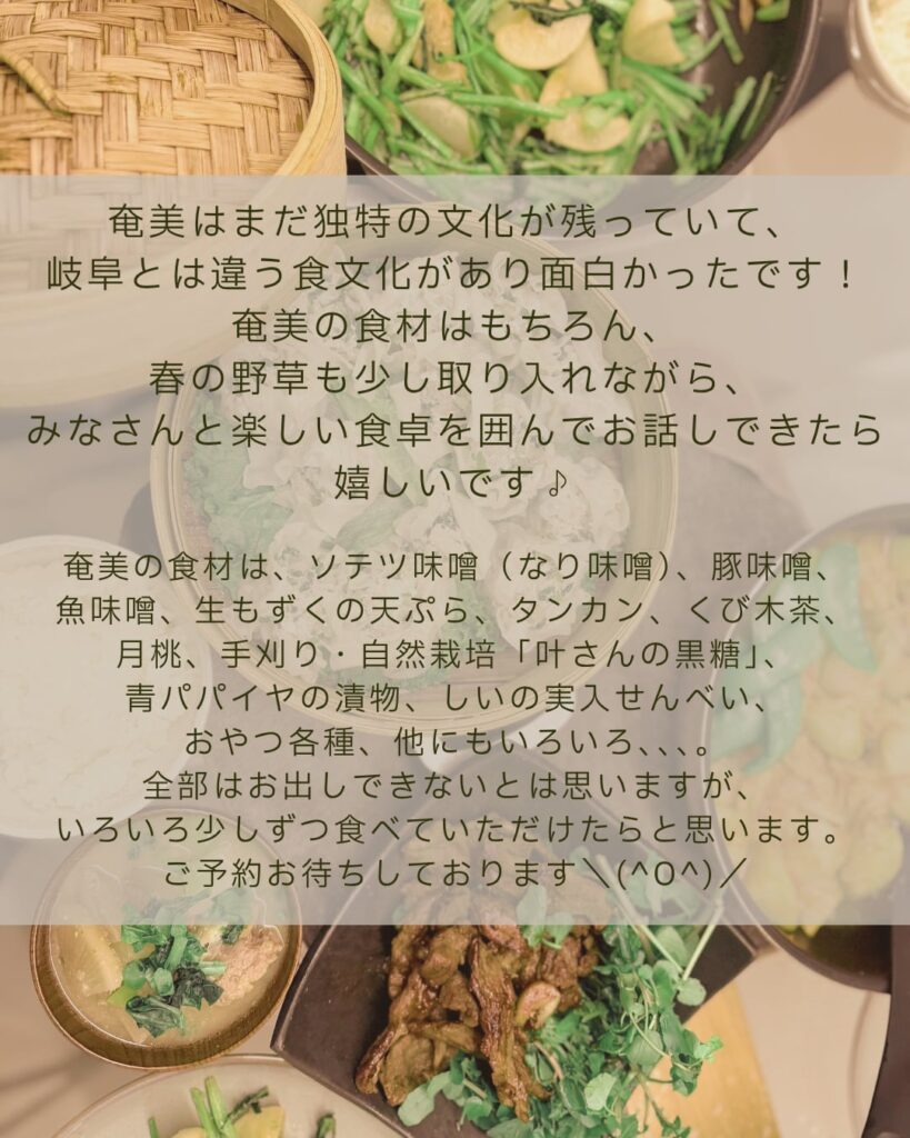 奄美はまだ独特の文化が残っていて、岐阜とは違う食文化があり面白かったです!奄美の食材はもちろん、春の野草も少し取り入れながら、みなさんと楽しい食卓を囲んでお話しできたら嬉しいです♪
