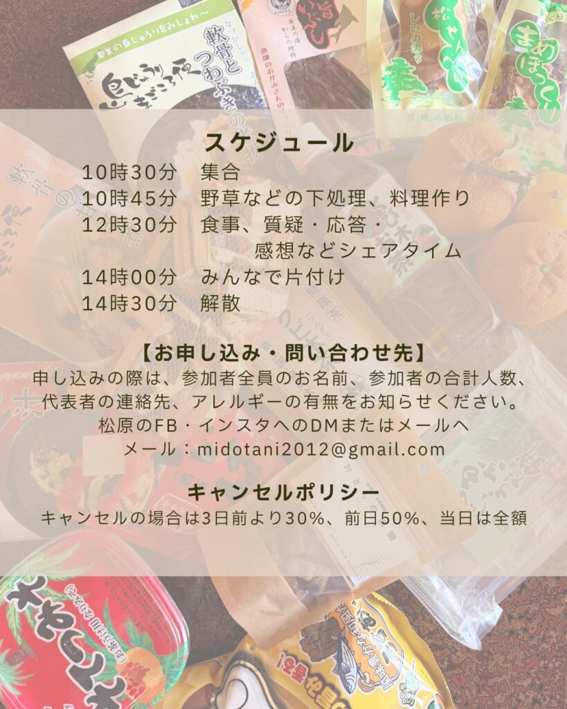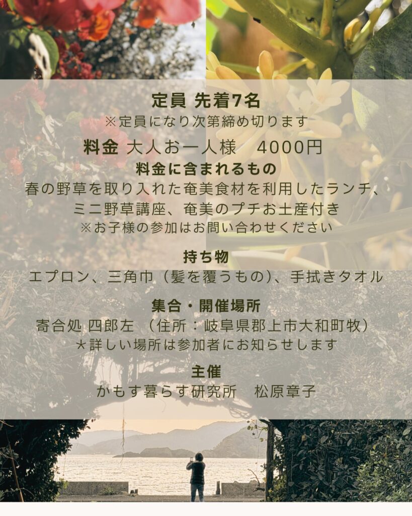 4/7に「半谷美野子さんと春の野草と奄美を味わう会」の募集をしたところ、思いのほか参加者がすぐに集まり、ありがたいことに満員御礼となりました。