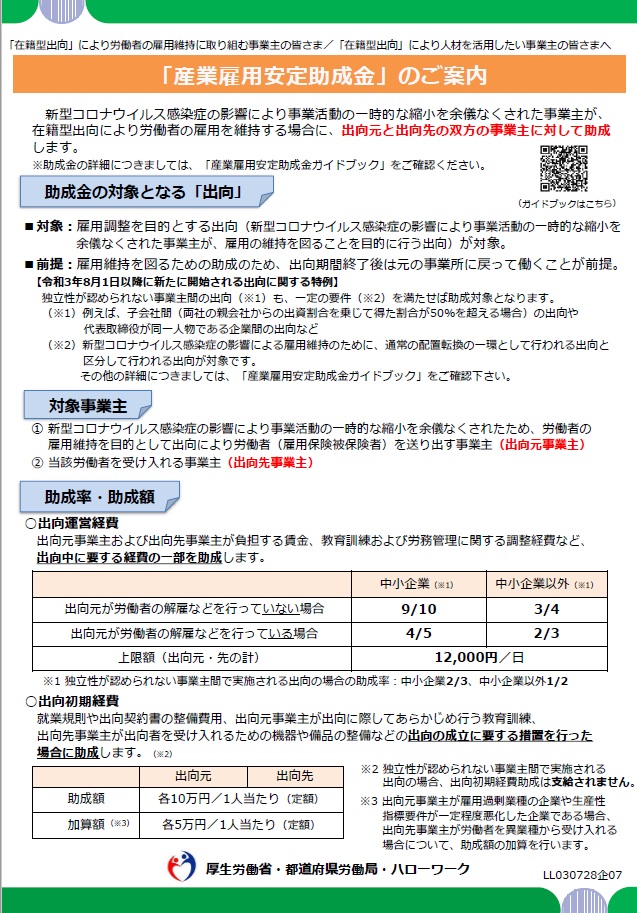 厚生労働省では、新型コロナウイルス感染症の影響により事業活動の一時的な縮小を余儀なくされた事業主が、在籍型出向により労働者の雇用を維持する場合に、出向元と出向先の双方の事業主に対して助成する「産業雇用安定助成金」を運用してきたところです。