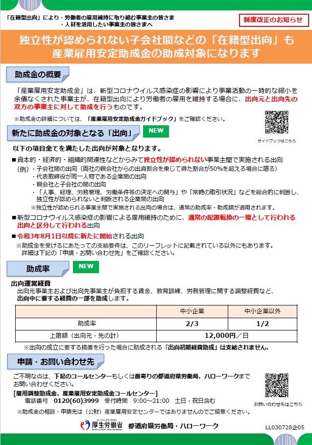 1.「産業雇用安定助成金」制度改正のご案内(厚生労働省)