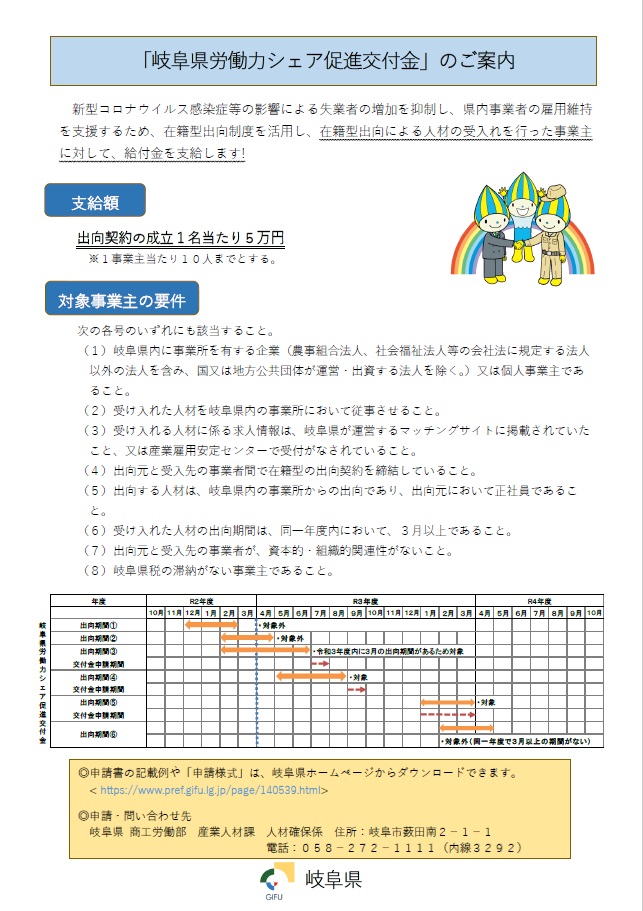 県では、新型コロナウイルス感染症等の影響による失業者の増加を抑制し、県内事業者の雇用維持を支援するため、在籍型出向制度を活用し、在籍型出向による人材の受入れを行った事業主に対して、交付金を支給する「岐阜県労働力シェア促進交付金」制度を設けています。